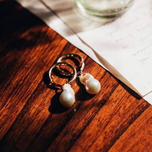 金環耳環配上垂釣著淡粉色魚尾巴洛克珍珠,設計簡單復古風,適合不同場合配戴。