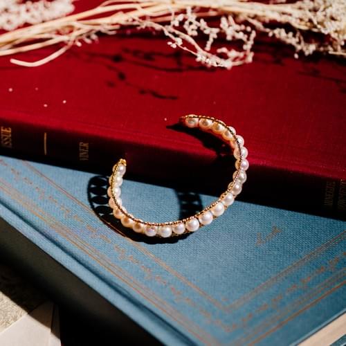 材料:14k包金鈕花雙線圓C形手鈪、白淡水珍珠